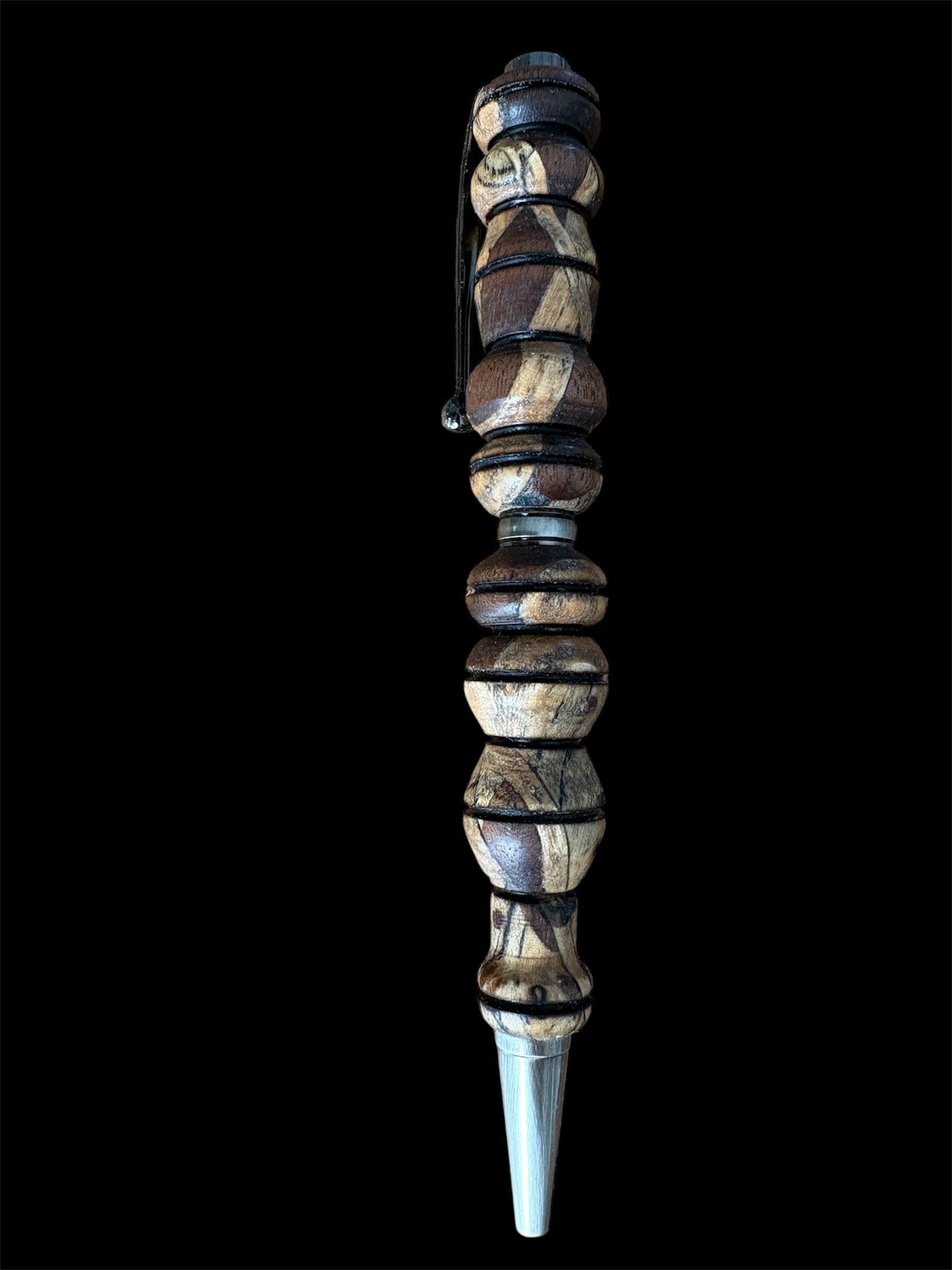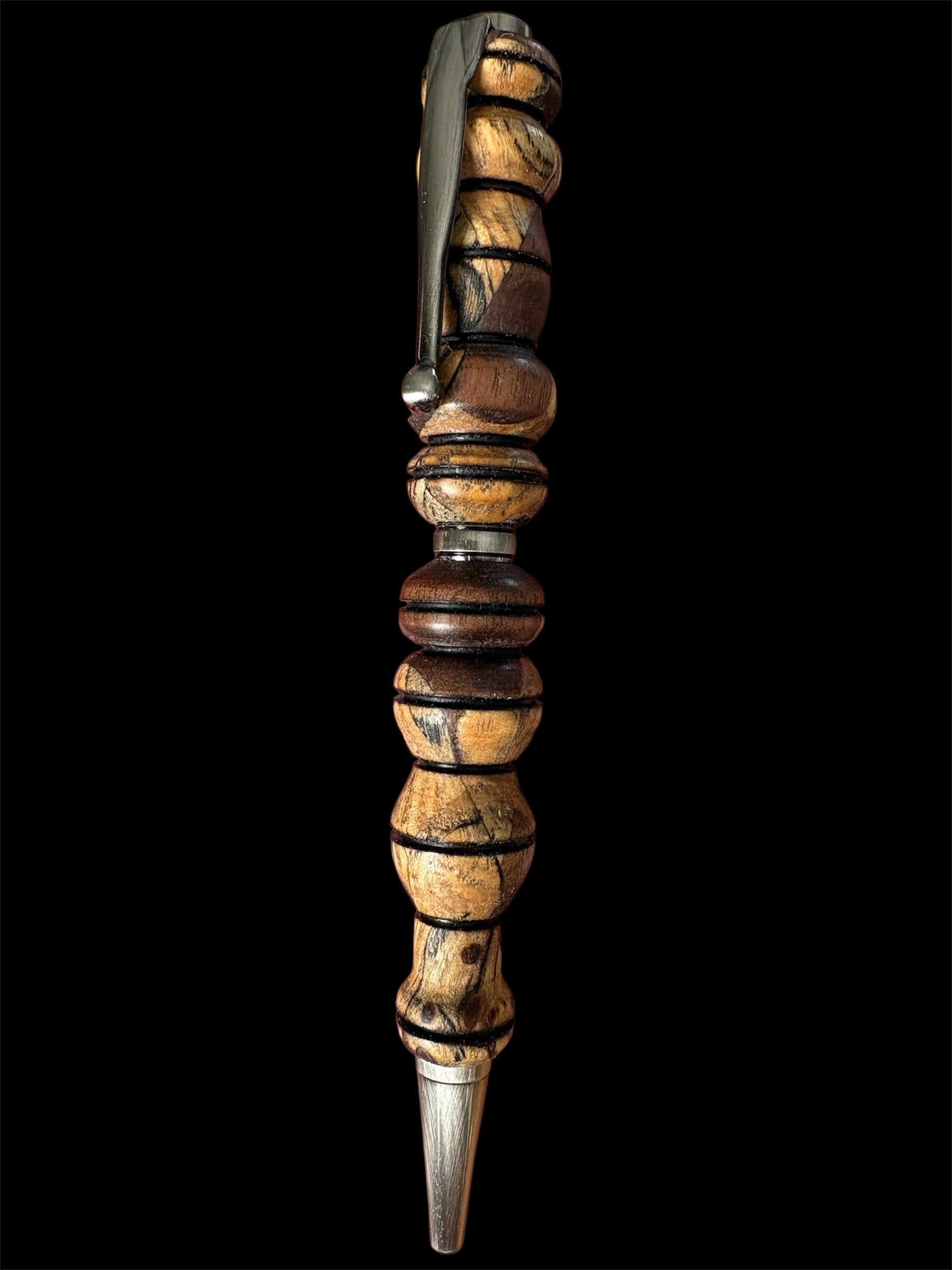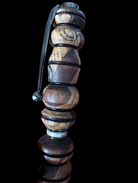 The Valhalla is a pen that was hand-turned. The wood was all sustainably sourced from fallen timbers. Accepts Cross pen ink refills, which are widely available. Made of white oak, black walnut, and spalted maple. Spalting occurs when a dead (usual fallen) log starts to decompose. The black lines are made by a fungus that follows the tree's vascular system.